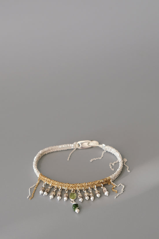 Materials: 925 sterling silver, gold plated silver chain, 2mm pearls, green garnet, silver clasp